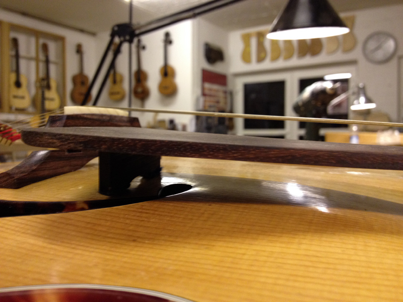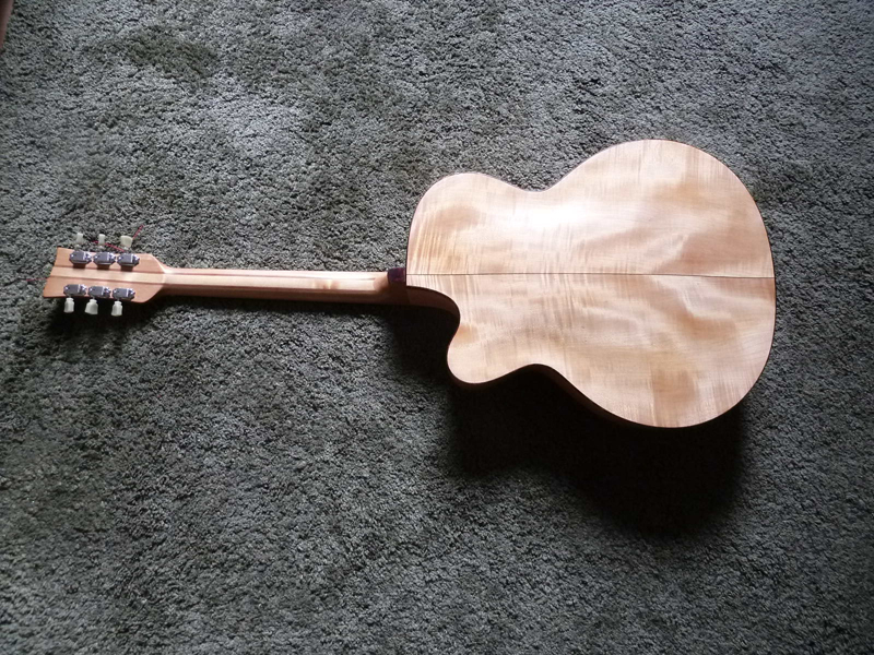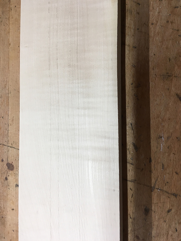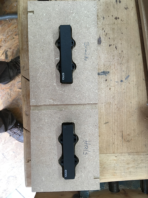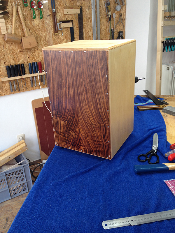 Cajon KlangEins, Cajon fertig, Ansicht von vorne Ahorn-Hals Fräs-Schablone für PickUp-Fächer testen