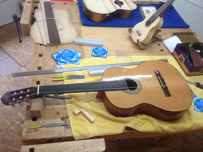 Tanpura, zum Verleidern den Kürbis mit Gummibändern umwickelt fretless guitar, Saitenlage einstellen Ukulele bauen, Ukulele fertig mit Saiten, Vorderseite