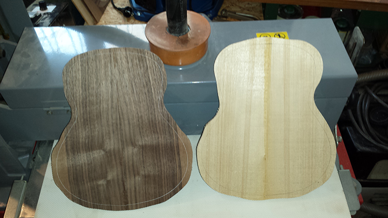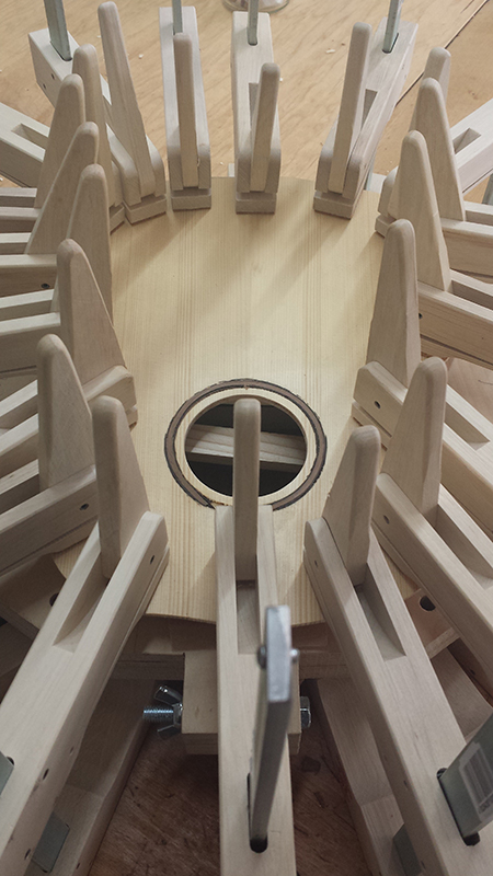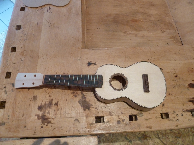 Cavaquinho bauen, Boden und Decke auf grobe Form gesägt Cavaquinho bauen, Decke anleimen Ukulele bauen, Body mit Hals von vorne mit Steg (nur hingelegt)