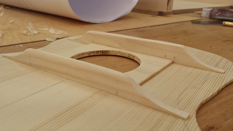 Ukulele bauen, Boden an Zargen leimen Cavaquinho bauen, Balken an Decke geleimt und in Form gebracht Ukulele bauen, Halsfuß schnitzen