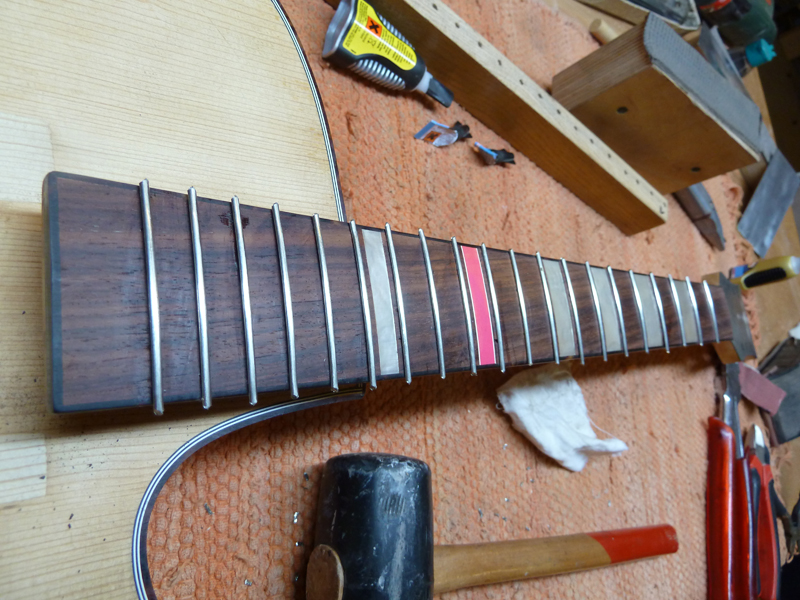 Cajon KlangEins, Schallloch mit Schraubenbohrung fretless guitar, fretless Guitar soweit fertig Jazzgitarre restaurieren, neue Bünde einsetzen