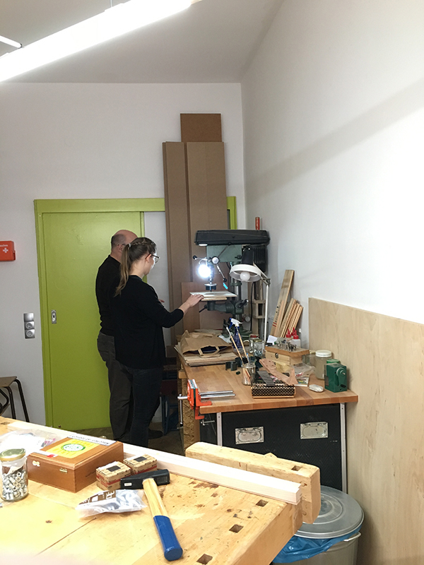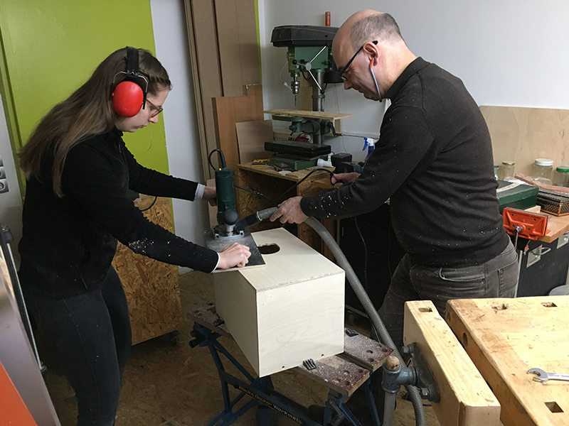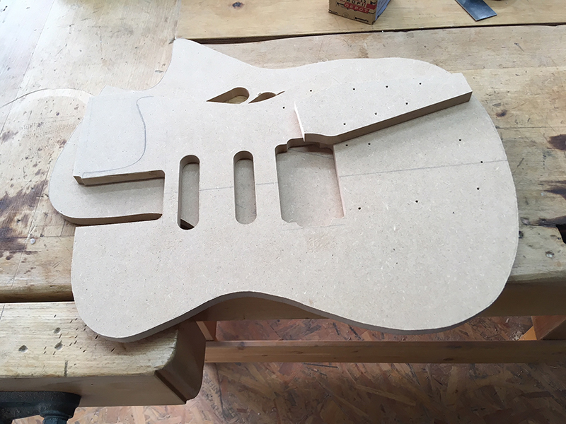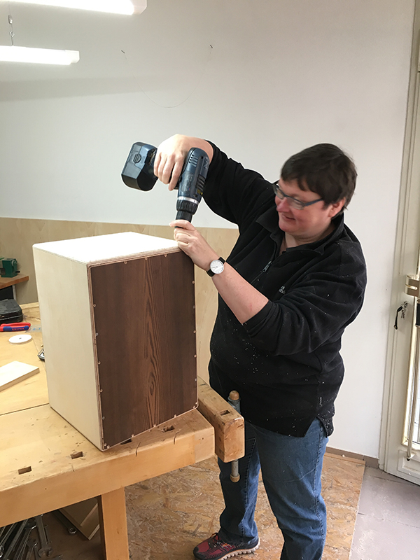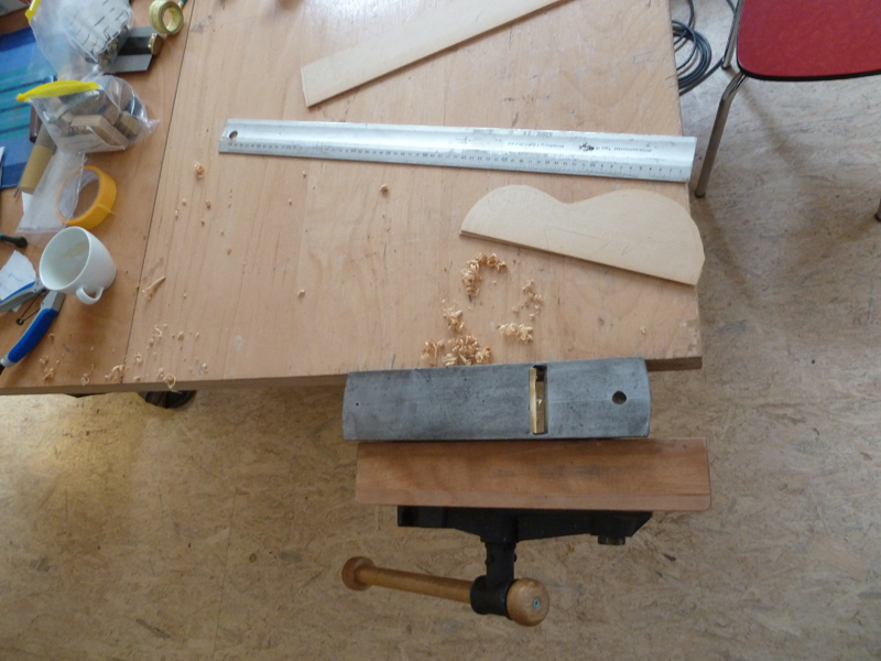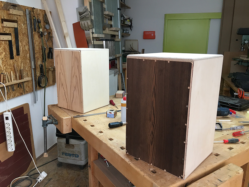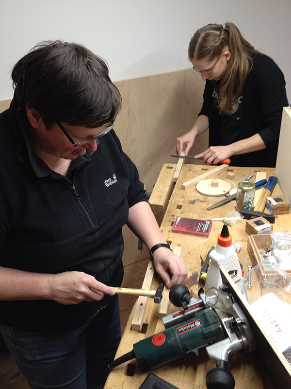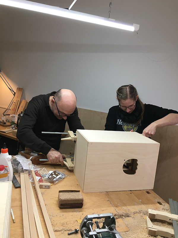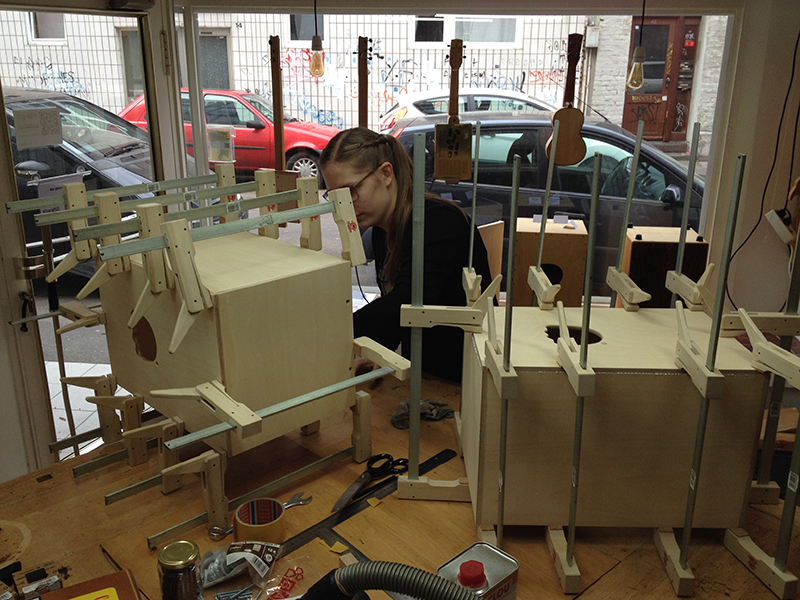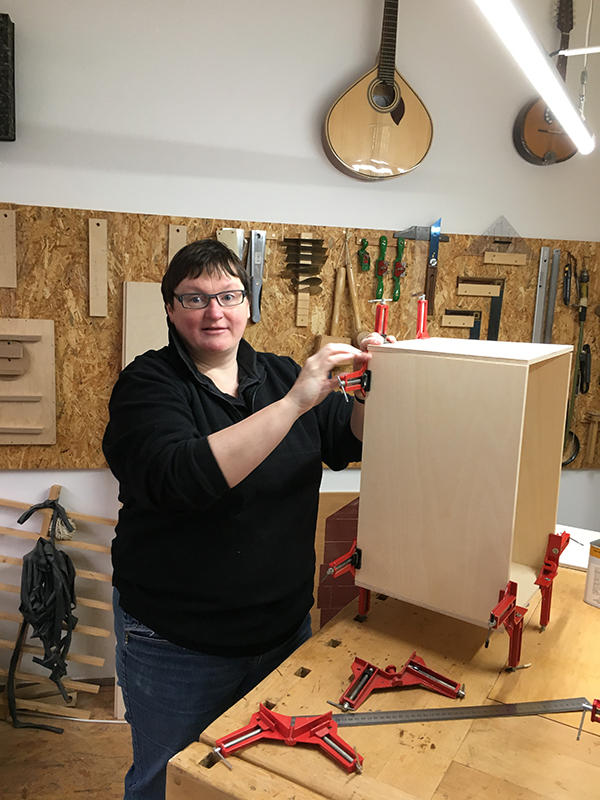 Hollow-Body-E-Gitarre, Body und Decke Ukulele bauen, Bundstäbchen in Griffbrett drücken, Detail Ukulele bauen, Ukulelen-Kopf mit Mechaniken, hinten