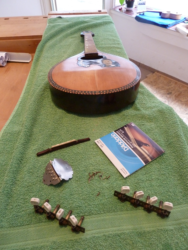Mandoline restaurieren, Mandoline und wieder einzubauende Einzelteile und Saiten Ukulele bauen, Rosette Ukulele bauen, Body Boden