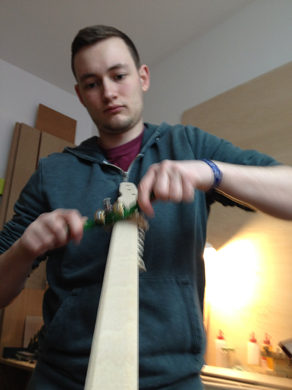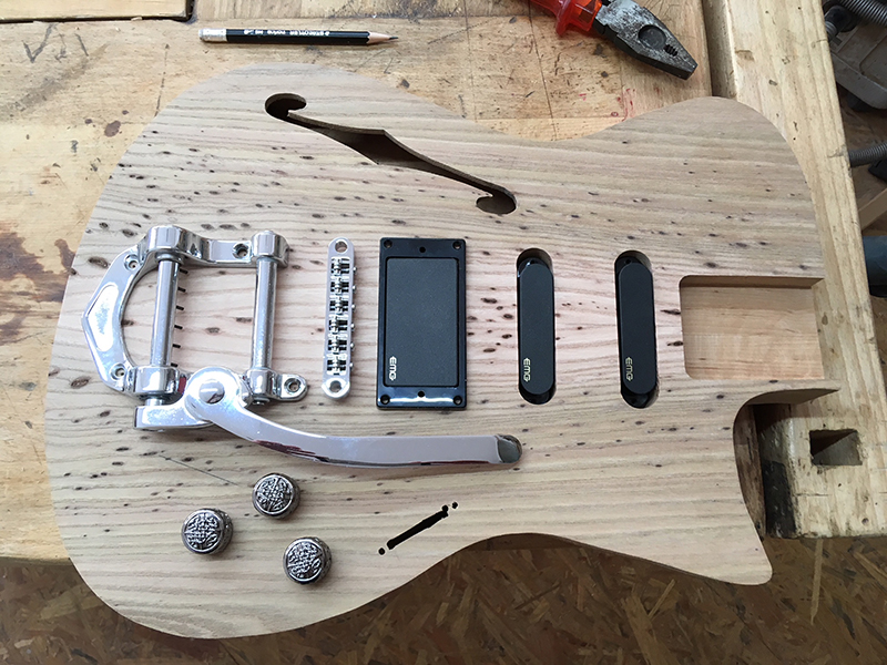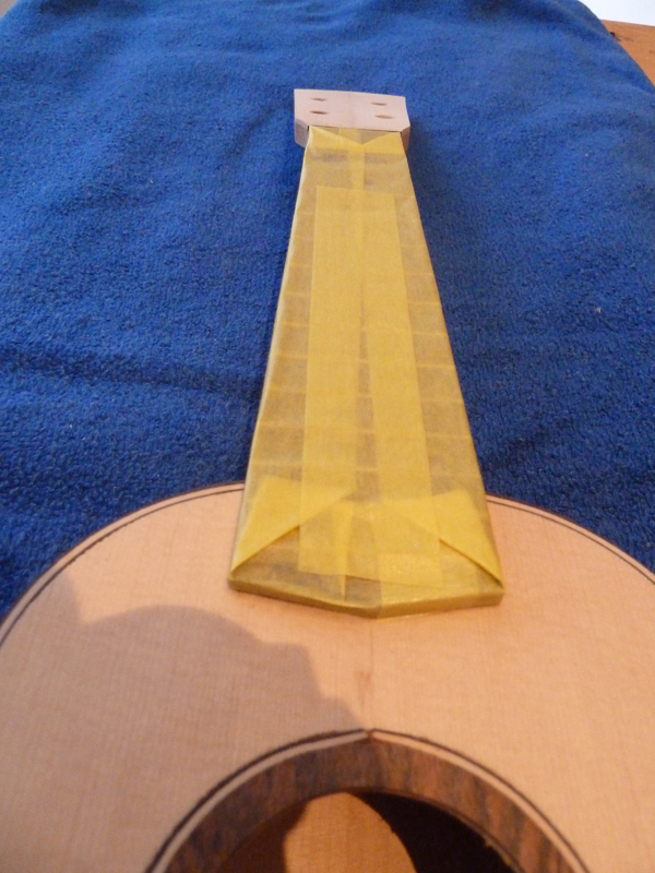 Hollow-Body-E-Gitarre, Body fertig zur "Anprobe" Cigarbox-Guitar, Hals runden Ukulele bauen, Griffbrett abgeklebt